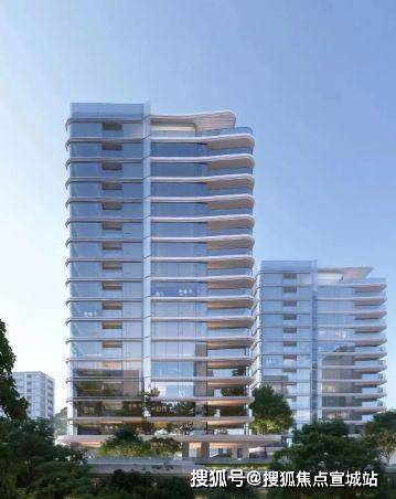 杭序府的外立面采用弧线转角阳台+蓝灰色钢化LOW-E玻璃,公建化立面拥有超高窗墙比。同时,大量曲线元素的运用,不仅造价昂贵,而且极具辨识度,成为区域的颜值担当。