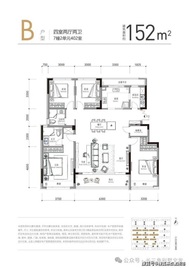 四房户型均为四叶草户型,方正通透,双阳台、最大至6.3米宽大尺度客餐厅,且均配置独立储藏间。