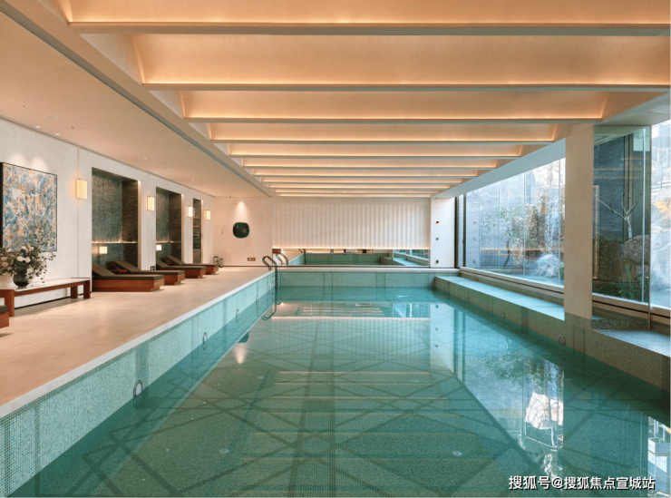 恒温泳池:采用全景落地玻璃墙,巧妙消融了室内与自然的界限。畅游其间,庭院山石如天然屏风倒映眼前,仿佛在自然山水间徜徉。