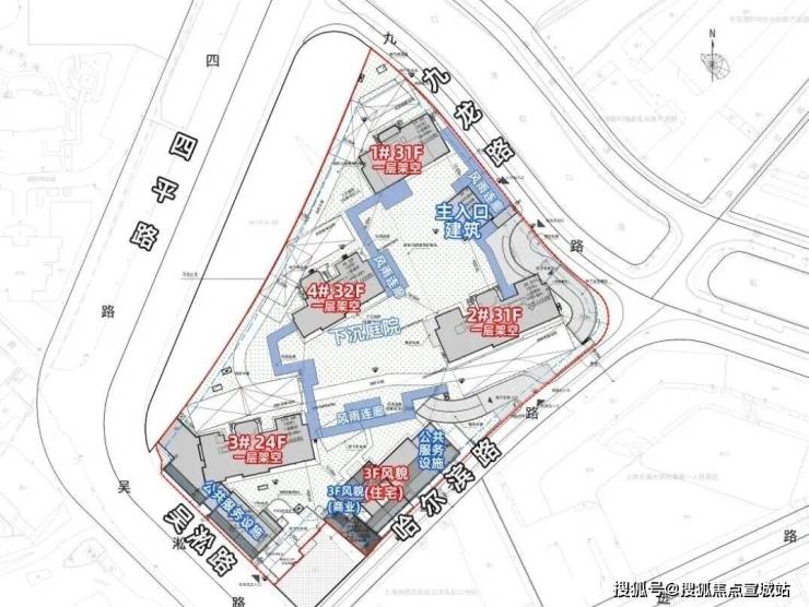 4栋住宅一层全部为架空,入口至楼栋间设置有风雨连廊。