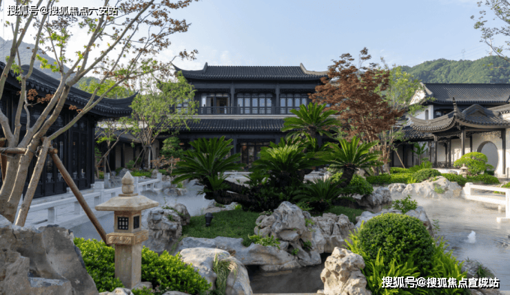 江南园林甲天下,苏州园林甲江南,比如像我们现在看到的园林布局,就是经典的苏州园林景观,讲究引水入园。造景围绕着这片水景展开,空间上比较有层次感。近景是流水、堆石,中景是连廊、假山,远景是中式合院的院墙、屋檐。