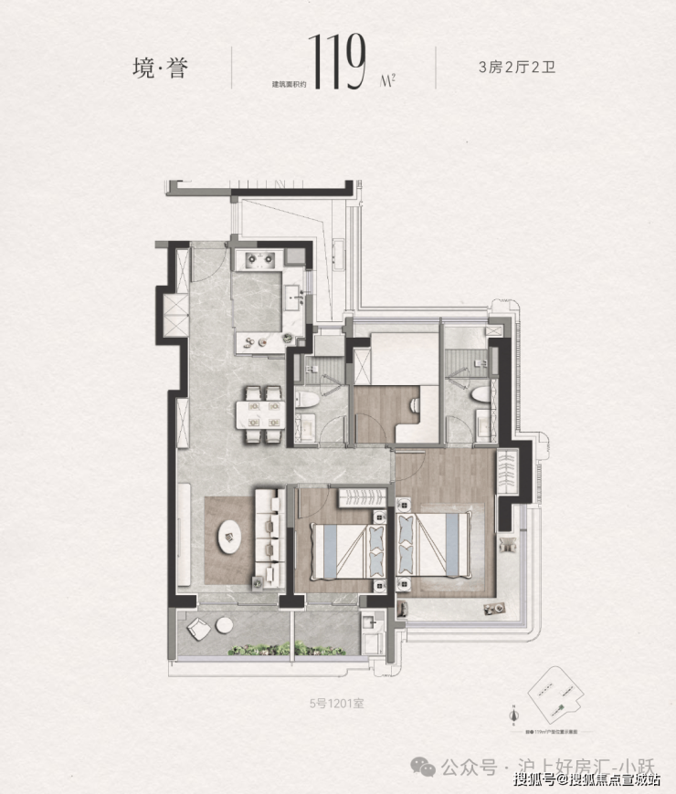 边套A户型是三面采光户型,客厅连接阳台,视野出众。