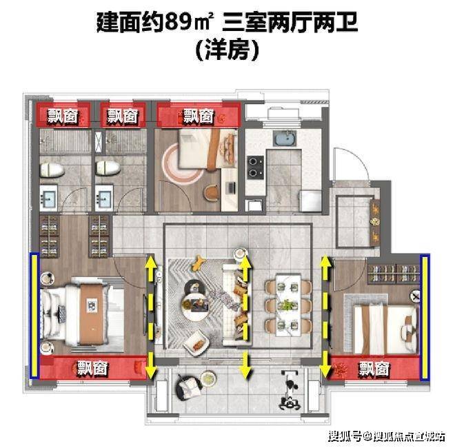 整体设计方正,南北通透, 拥有约11.2米超阔南向面宽。餐客阳台一体设计,大大提升了空间的视野,看起来明亮宽敞,亲友家人聚会不会显得太局促,同时功能分区明确,也成就了难得的建面约89㎡四开间朝南。 全户型5个飘窗,让生活更惬意;充足的收纳设计,日常起居变得井然有序。双卫干湿分离,也为平常盥洗创造了更舒适的使用空间。