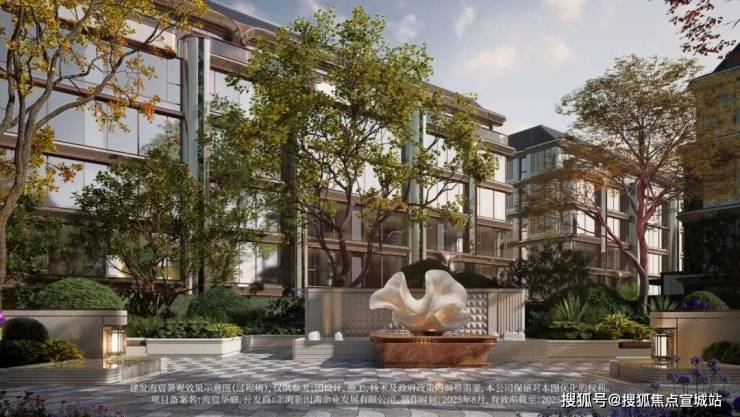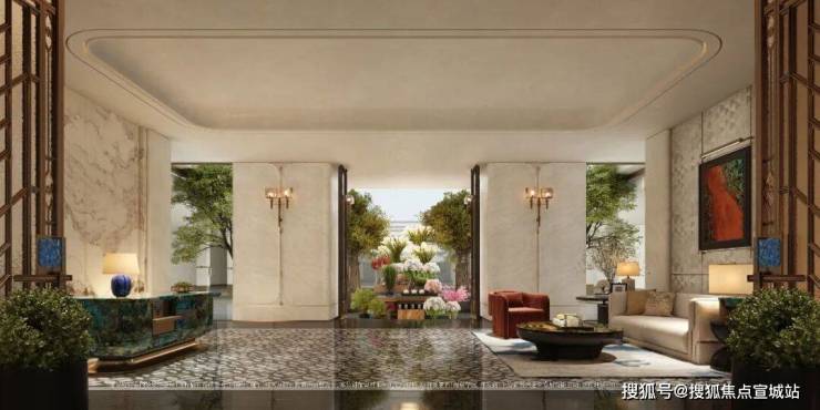以玉兰门庭—迎归大堂—莳花荟为主轴,敬献步履生辉的归家艺旅:玉兰门庭如繁花盛绽,尊华瑞鳞水景聚运生财,双尊铜狮镇守家宅;迎归大堂流转光影艺韵,百羽栖澜艺术雕塑、芦海宸韵非遗绣作流淌摩登气韵;莳花荟中央会客厅移步异景,献映会客、休闲等雅会。