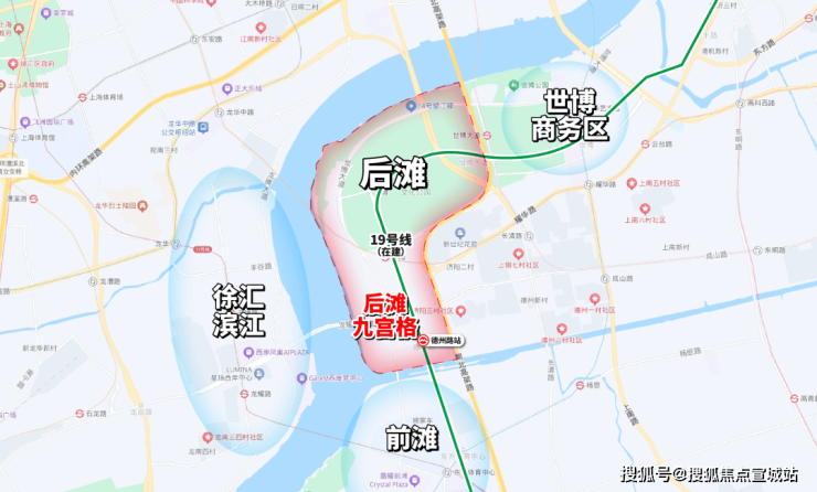 交通方面:原有7号线后滩站,串联徐汇滨江、静安寺等核心商圈,但相对来讲,站点近后滩商办,离九宫格略远;