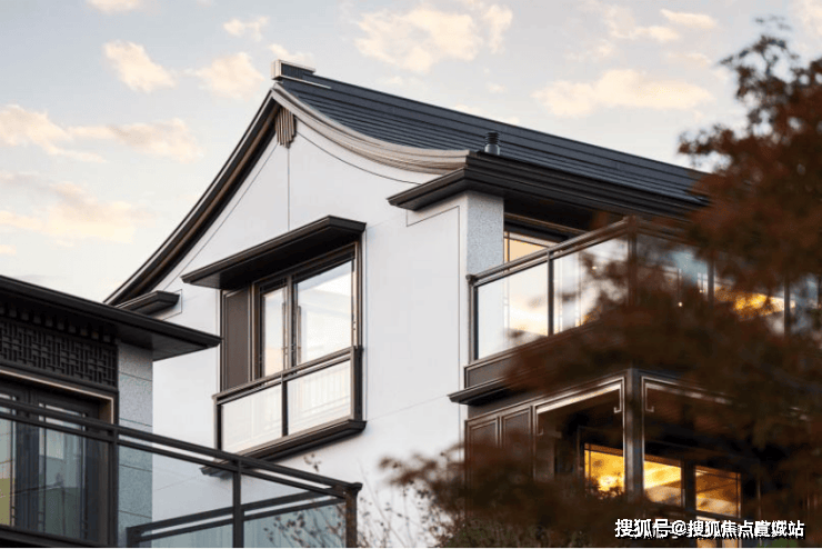 新中式,院墅,中式的坡屋顶与通透的大玻璃立面结合,将东方的传统意境与国际化的审美融合,像极了当前的杭州也像极了此刻的龙坞,既老又新,既传统又现代,既有西子湖的温婉又有钱塘江的磅礴,碰撞出一种全新的审美与生活方式。溪映听庐隆起的屋脊,仿佛群山的绵延,大地与人文交织出全新的风景。建筑设计出自gad手笔,立面以浅灰石材、咖啡色铝板、涂料为主,主打一个“水墨淡彩”,悬山顶出檐深远、举折平缓。