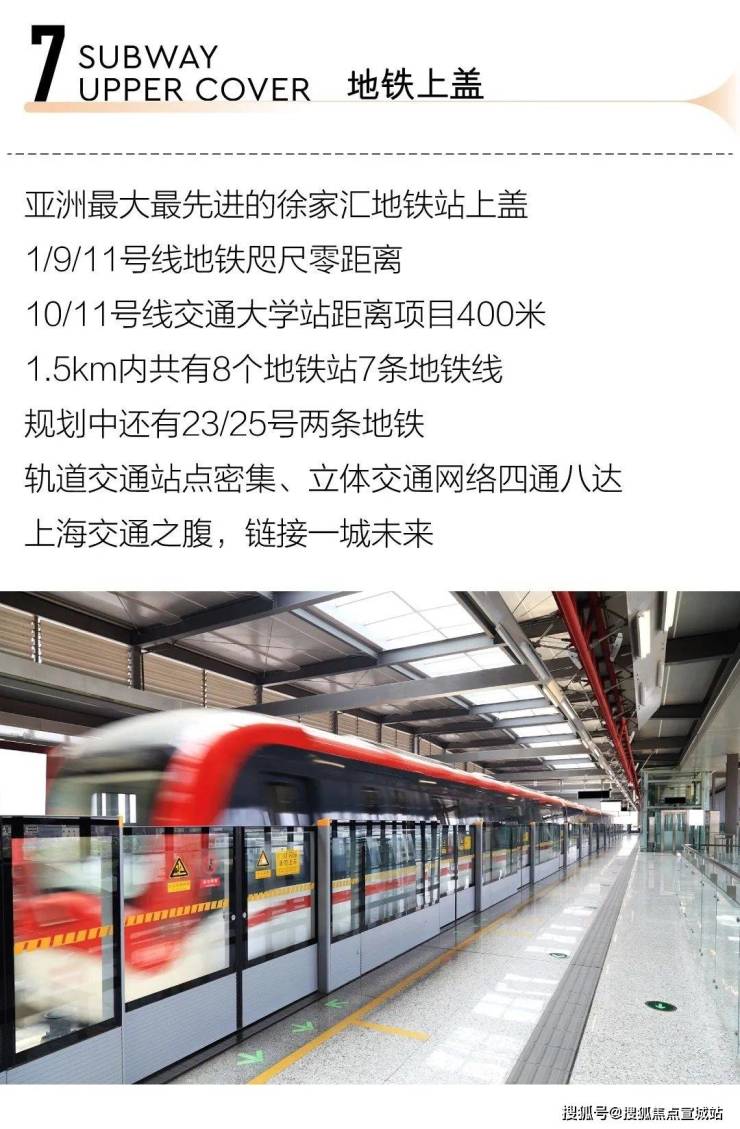 地铁:亚洲最大最先进的徐家汇地铁站上盖,与 1/9/11 号线地铁零距离;10/11 号线交通大学站距离项目 400 米,1.5km 内有 8 个地铁站 7 条地铁线,规划中还有 23/25 号两条地铁。