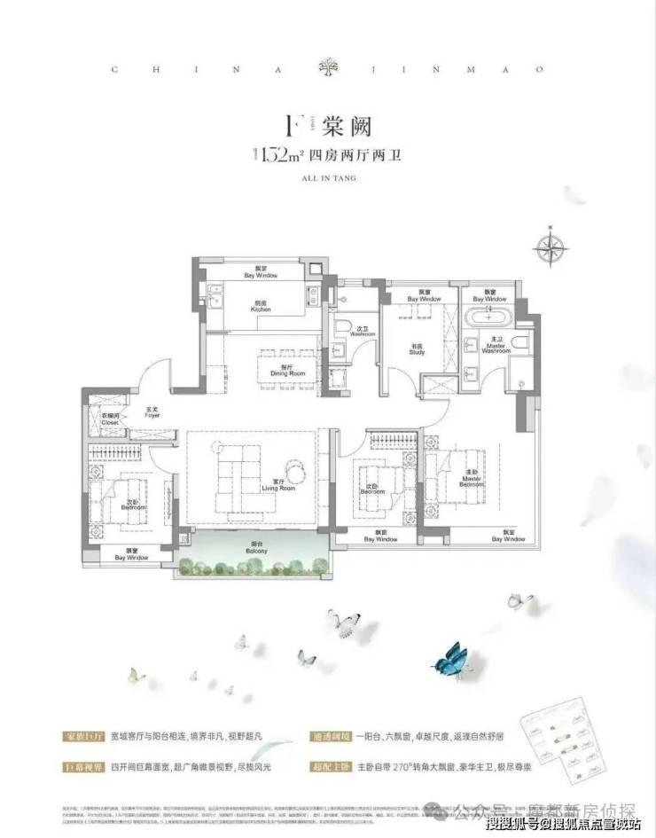 建面约117㎡3房2厅2卫,做到了3+1开间朝南+5个飘窗+主卧套房设计+270°转角飘窗,所有的尺度都有进一步提升。