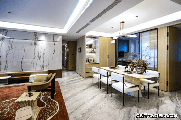 希腊灰密拼瓷砖、四边吊顶结合悬浮反光灯槽、岩板电视墙与浅米灰墙布相衬,共同营造出现代雅致的氛围,家庭聚会与商务接待皆可从容应对。