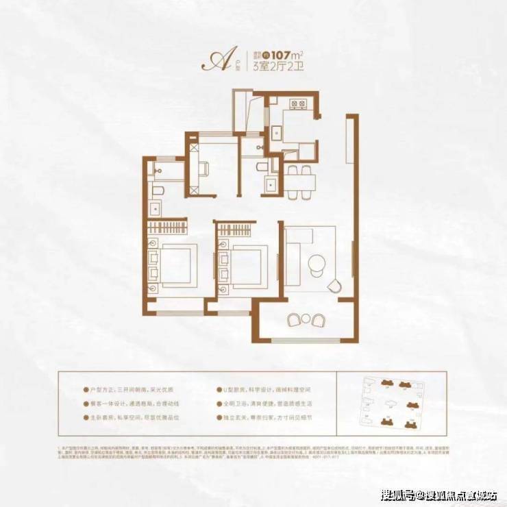 建面约107㎡三房的户型,三开间朝南,大面宽阳台,餐客厅一体,还有精细化收纳体系,人性化细节设计,极具功能性与舒适性,满足高阶精致生活。