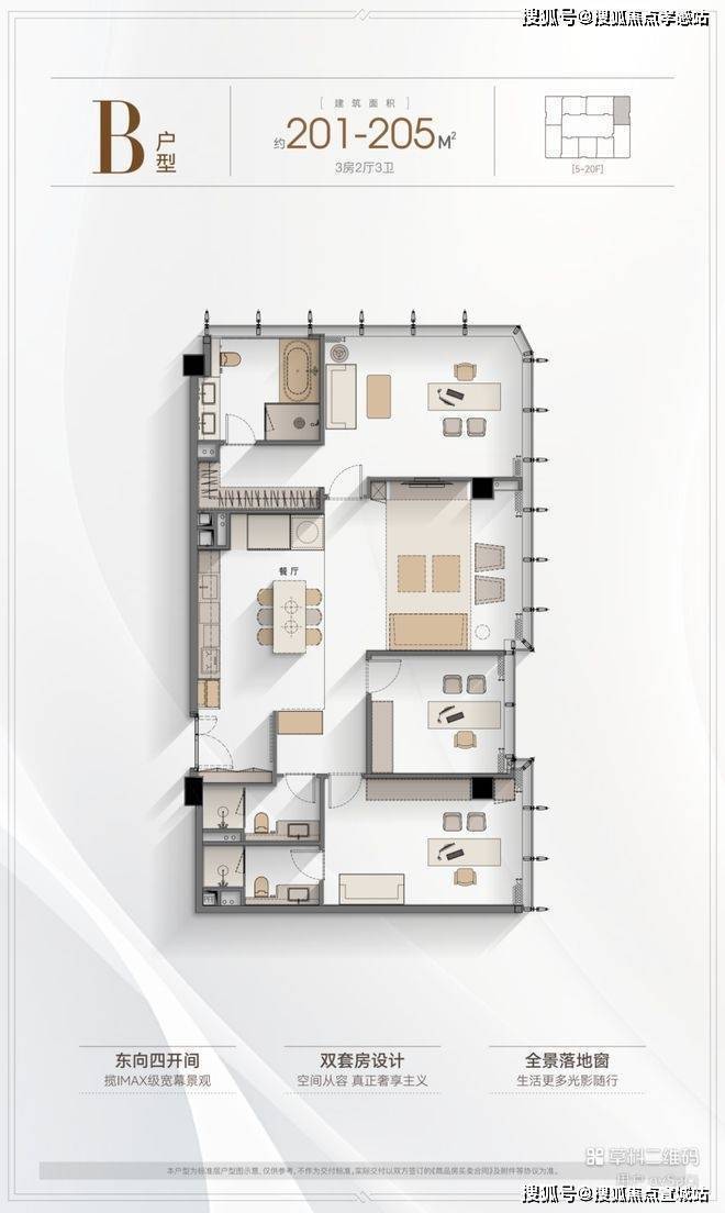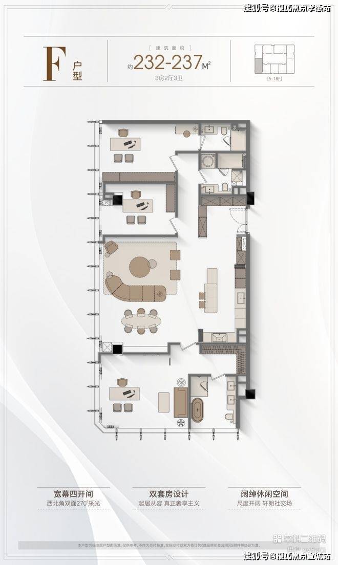 5户型优势:4.2米层高,全落地窗设计,多套房设计满足三代同堂