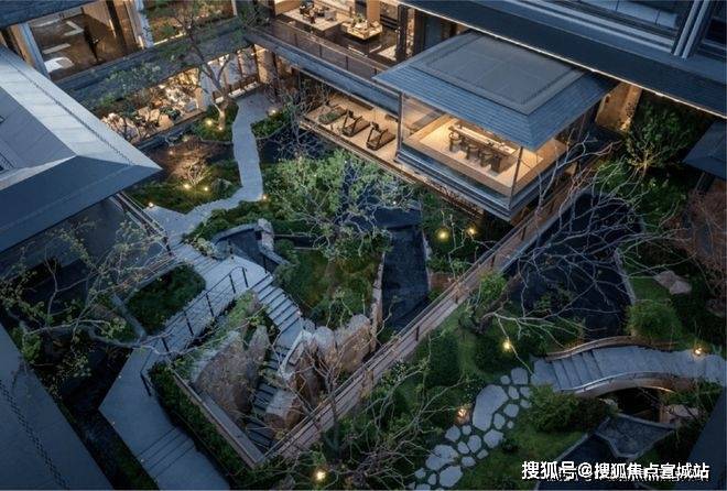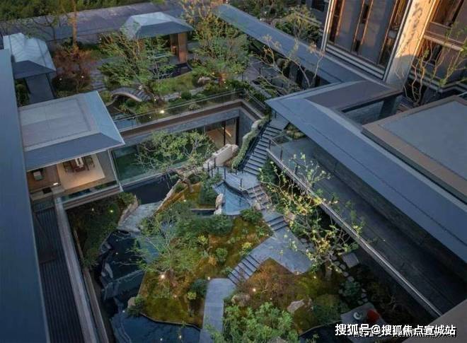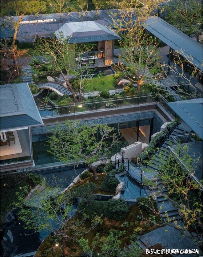 而最令人惊艳的,当属约6米地势差打造的下沉式山水庭院,山、石、水、林有序交织,犹如一幅“豁然开朗”山水轴卷,每一步皆是景致,每一处皆有不同。