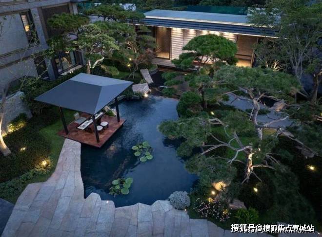 庭院的选材也极具讲究:太行山金景石堆叠成小山丘,岭南古桩铁冬青与中华原生乌桕树移栽而来,蕴含“聚财守业”的美好寓意。细节之处,经得起推敲,让人越看越有味道。