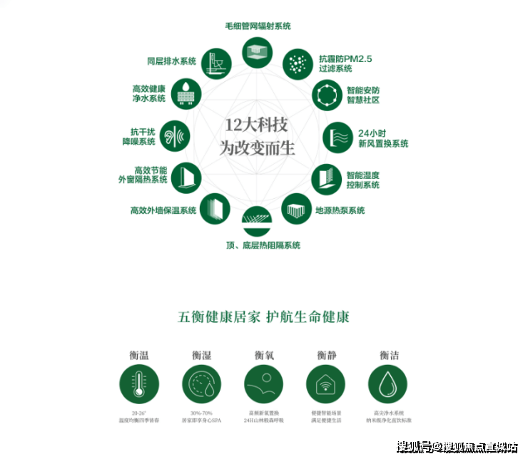 科技系统:引入十二大绿金科技与五衡系统,营造恒温、恒湿、恒氧、恒洁、恒静的居住环境。