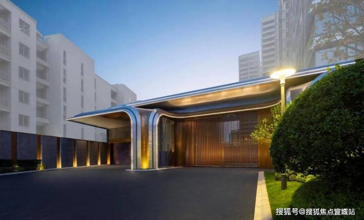 建筑设计:采用 ART DECO 风格,香槟金铝板搭配鎏金玻璃幕墙,公共区有蓝眼睛石材悬挑雨棚、拱门连廊等元素。