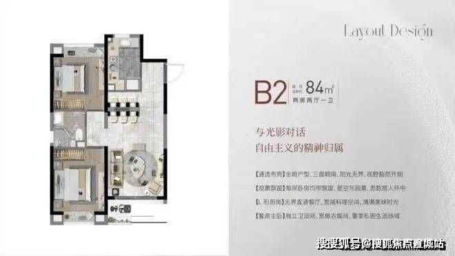 建面约84㎡2房2厅1卫,做到了双开间朝南+双卧室带飘窗+动静分离,非常宽敞的2房户型。