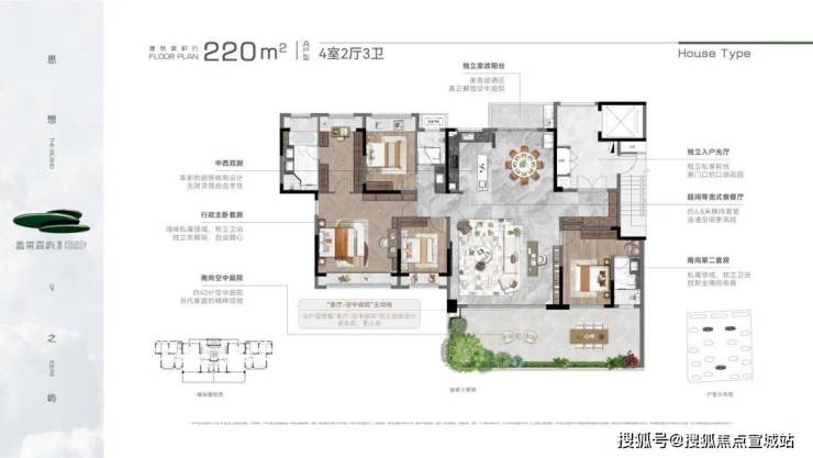 建面约220㎡的「典藏版墅居」堪称空中墅居的终极形态,独门独户+双重归家动线+前庭后院+无界景观+墅级挑高+动静有序+星级主卧。