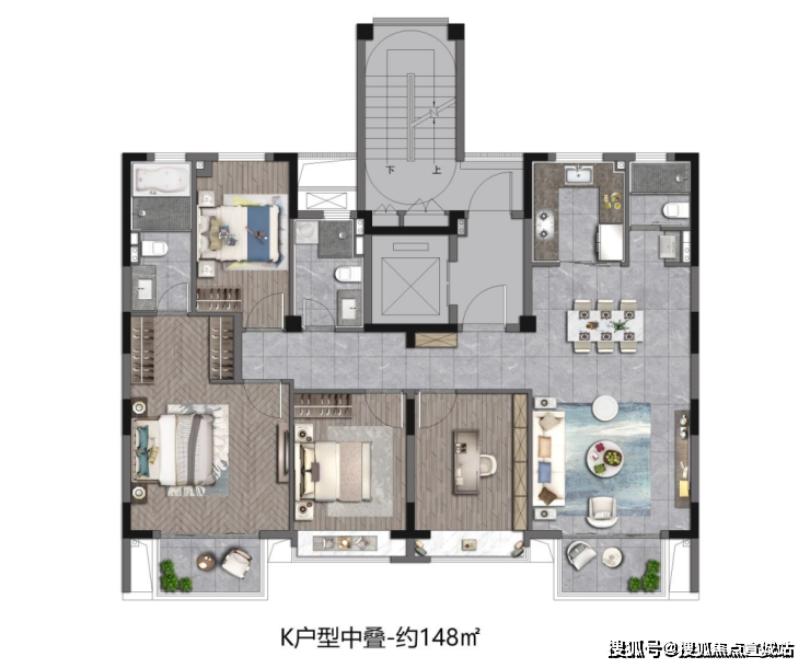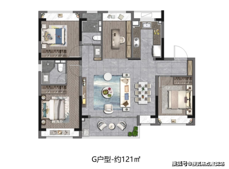 建面约121平 4房2厅2卫,宽境4房,拓宽空间尺度;大开间、进深短,通透采光;主卧独立卫浴,优雅随心的寝居感受。