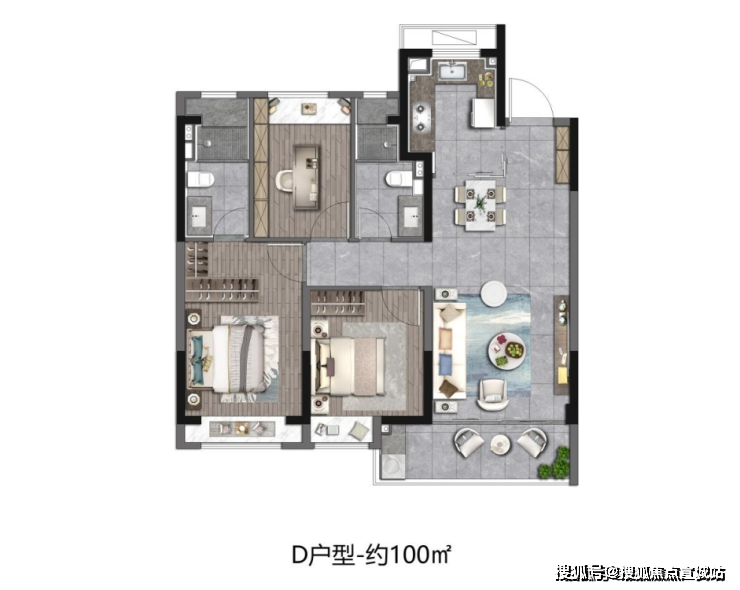 建面约100平 3房2厅2卫,阳光3房,宽幅南向观景阳台,步入式衣帽间。