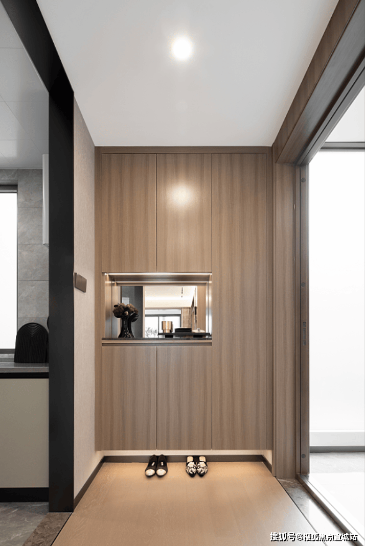 比如入口处有玄关柜设计。玄关柜下方预留空间,可放置扫地机器人、家里摆放换穿的拖鞋,把隐藏空间放置在了下方。