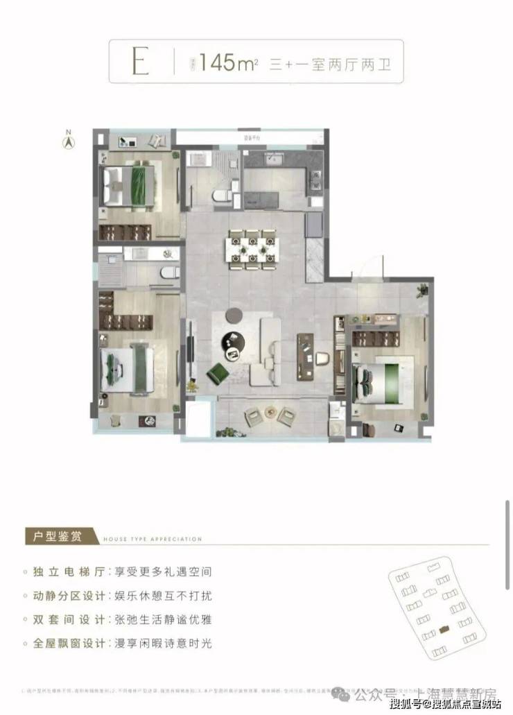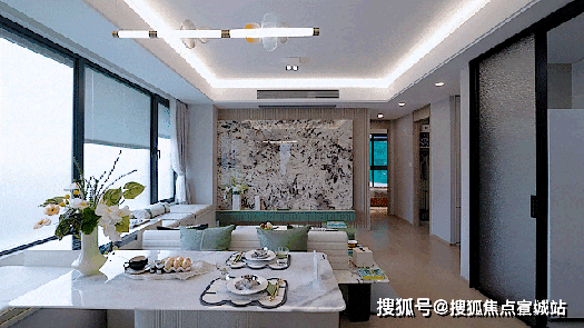 南向3.5面宽边厅的户型设计,一梯一户的电梯厅基本可以独享;客餐厅一体化设计,270°的超广视角,居住者足不出户就能坐拥长卷式观景体验;南向双套卧设置,实现精致而又尊奢的世家生活风范。