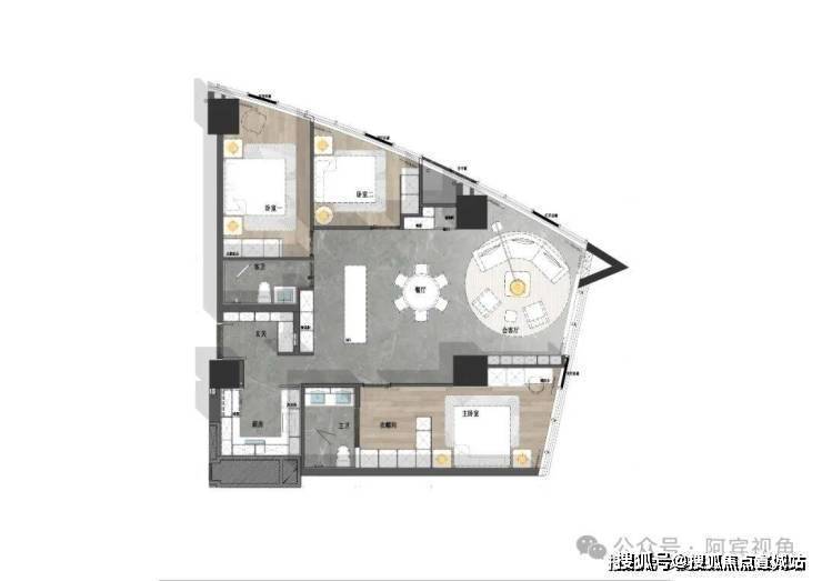 客厅空间舒适,电视背景面完整,可设置闭合式移门,拓展客厅空间的多用性;