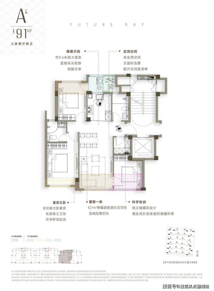 ◎约91㎡:三房两厅两卫,得房率约95%,三房两卫+储藏间,客餐厅约27㎡,面宽约9.6米。