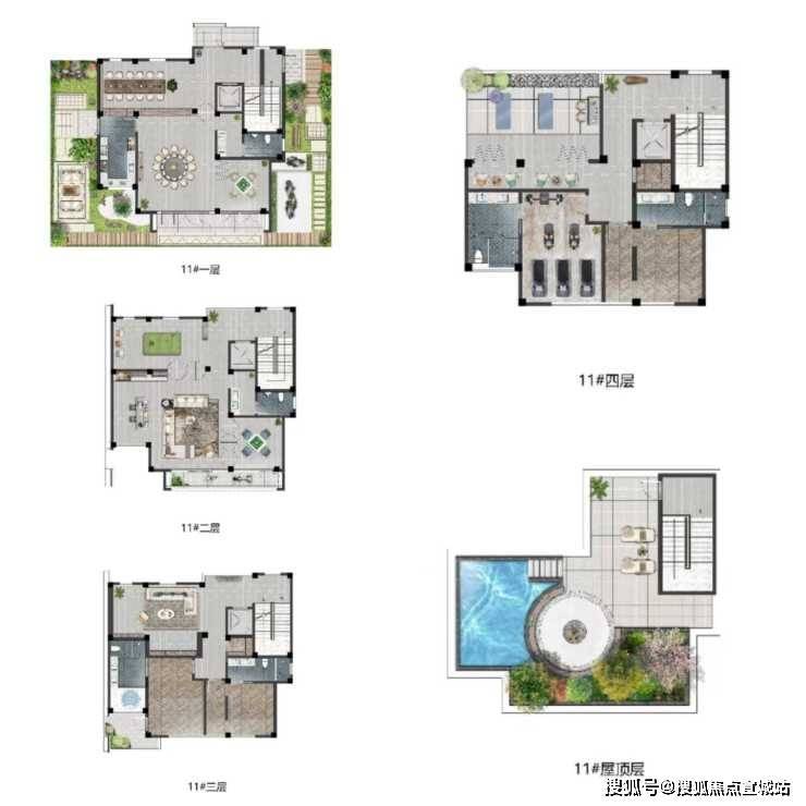 户型面积:550-585㎡独栋别墅,地上3-4层,层高4.49米,开间16.4米