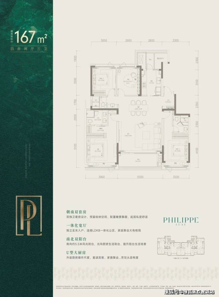 建面约167㎡南厅户型,四房两厅三卫,两梯两户,客厅南向开间5.5米,主卧开间3.9米,厨房北侧还配有小面积阳台。