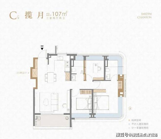 建面约107㎡的3房,客厅的面宽被拉长到了约4.7米;3S墙的设计,极大的扩容了家的储物角落;主卧、主卫双270°全景飘窗的设计。