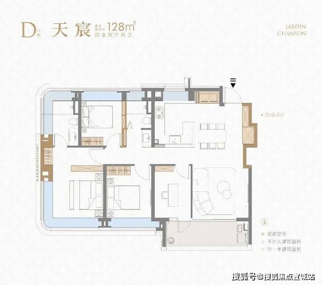 建面约128㎡4房延续3S墙和双270°全景双舱亮点的同时,尺度感极大提升,南向四开间,保证了更充沛的采光和视野。客餐厅+超大尺度阳台贯穿南北,进门视野无遮挡。