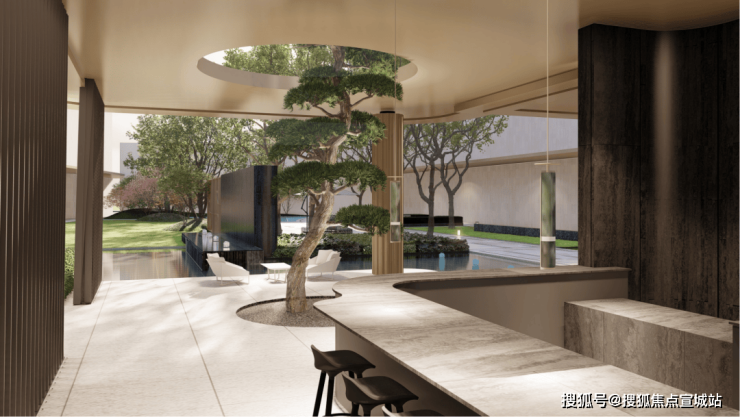 旁边半围合的室外会客厅,「长」在水庭中央;下沉式会客卡座,可以享受独处时光,也可以和邻居友人聊聊时事财经。