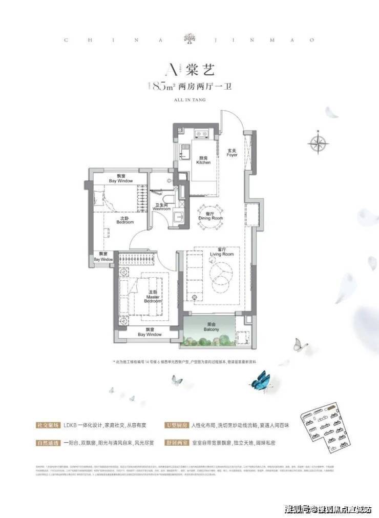 建面约105㎡3房2厅2卫,做到了三开间朝南+4个飘窗+双面阳台系统+主卧套房设计+270°转角飘窗,该户型的居住体验、舒适度、尺度感,是同级别产品所无法比拟的。