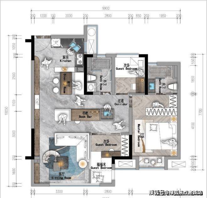 两次卧一个是带内卫的套房,一个是享有折角光源,自带明媚书房的休憩区。