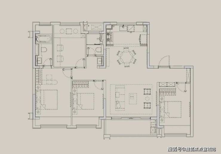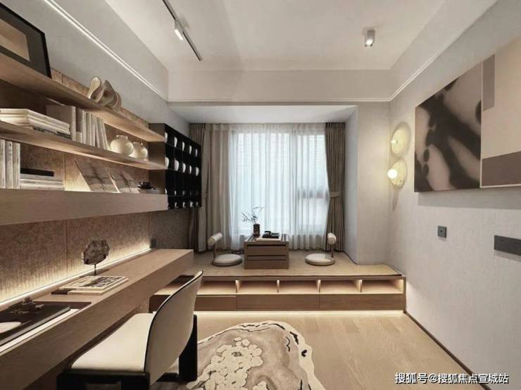 户内装修承袭宋代美学理念,在设计逻辑中将宋雅物道,诗意栖居的理念嵌入空间。客餐厅阳台采用木地板通铺。厨柜选用咖色漆面板,在视觉上效果协调。厨房移门选用夹丝玻璃,让厨房空间更好的与客餐厅空间联动。顶面四周灯带吊顶形式,拉高空间尺度感。