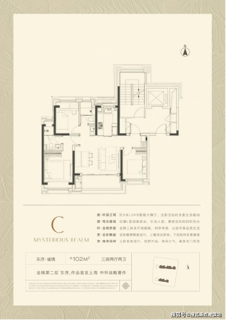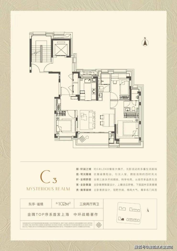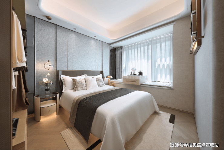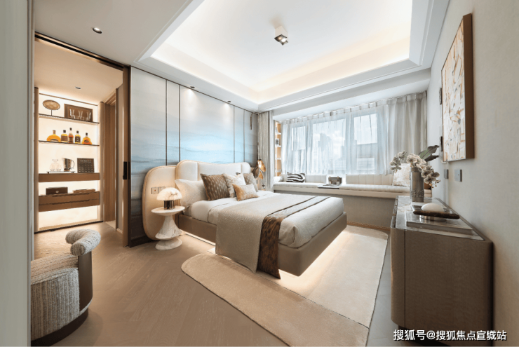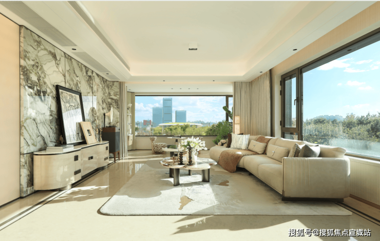 【约102㎡样板间】三房两厅两卫格局,同样的布局设计巧思应用于102㎡,打造出近乎双套房的生活体验。5米面宽横厅设计,营造极致通透感,臻选奢石融入空间,优雅时尚。厨房科学动线设计,搭配国际品牌五金和厨电,悦享精致烹饪时刻。星级主卧,独立卫浴,将空间最大程度延伸,打造舒居体验。