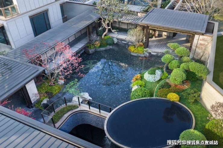 在阳光下,这处园林是变成了一幅流动的宋画,池底是游鱼的闲适,岸边是油橄榄、红枫与百年罗汉松婀娜交映。