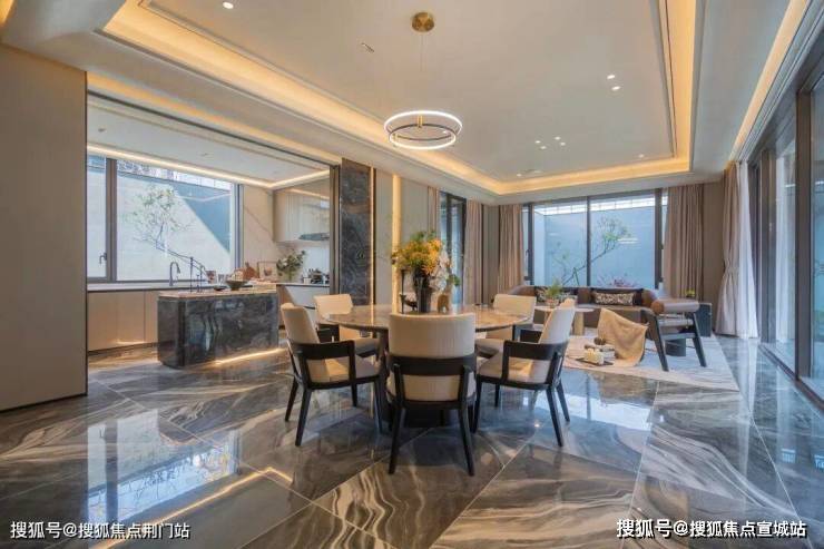 立体院居,功能臻配:叠墅与合院的奢享尺度建筑整体采用蓝眼睛石材、铝板、玻璃幕墙等材质,搭配香槟金和古典灰,为建筑增加高贵、庄重的气质。