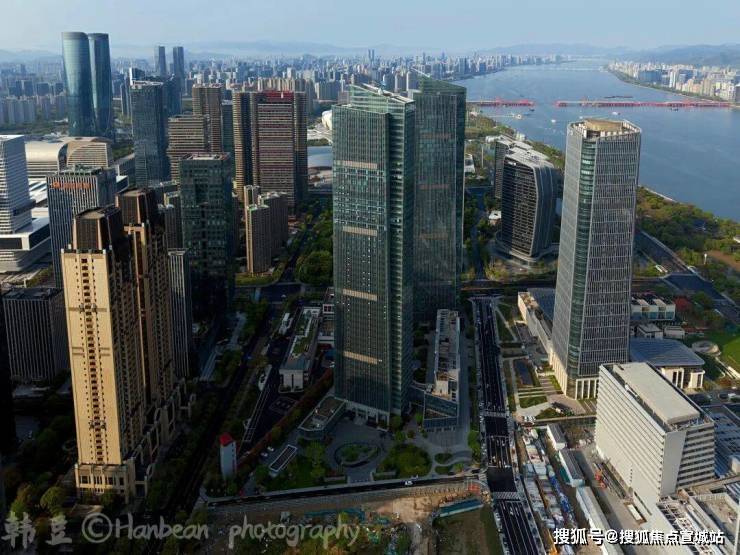 钱江世纪城是以150 m高超高层建筑为主的建筑群。从钱塘江北岸看,杭州国际办公中心的3个地块形成一组勇立潮头的沿江活力形象,成为世纪城江边地标建筑群之一。