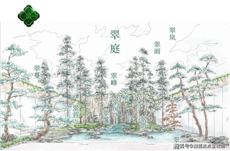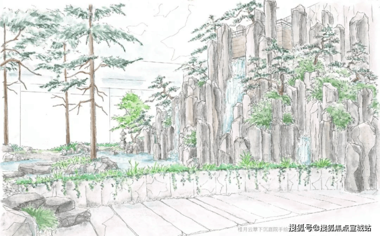 最终,在庭院这方微观世界中,筑山、步道、水瀑.....方寸之庭,处处皆景,充斥着综合的体验,令庭院与园区之间自成天地又相得益彰,吸引居者驻足。随着翡翠贯穿庭院,带来的感受细化至听觉、视觉甚至触觉。
