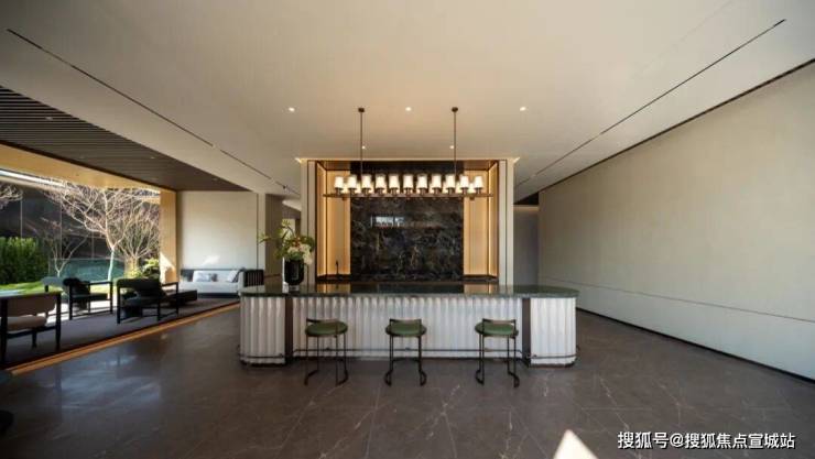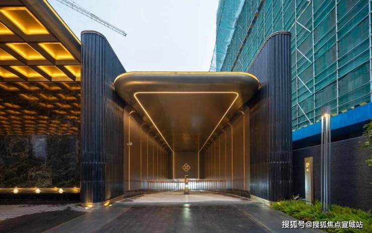 翠意流金的超50米宽、净高约6.45米的敞阔门庭,矗立一面艺术雕塑,在晚风中闪着荧荧微光,昭示着家的方向;沿着酒店式落客归来,中央迎宾水景、静水微澜与跌水如瀑交汇,塑造层层叠翠归家仪式,随之步入高奢酒店级大堂,铺展生活的序章。