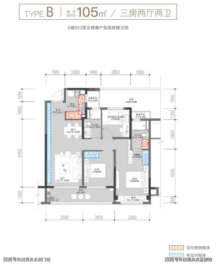 105㎡三房两卫:三开间朝南,南向面宽约10.2米,U型厨房+双联阳台,主卧套房设计