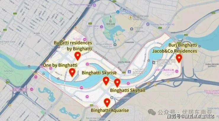 地理位置:阿联酋迪拜商务港(BusinessBay,中东“曼哈顿”),运河北侧核心地段,与布加迪豪宅为邻,距离哈利法塔、迪拜购物中心(DubaiMall)不足2千米,步行900米可达商务港地铁站(红线),无缝衔接全城核心配套。