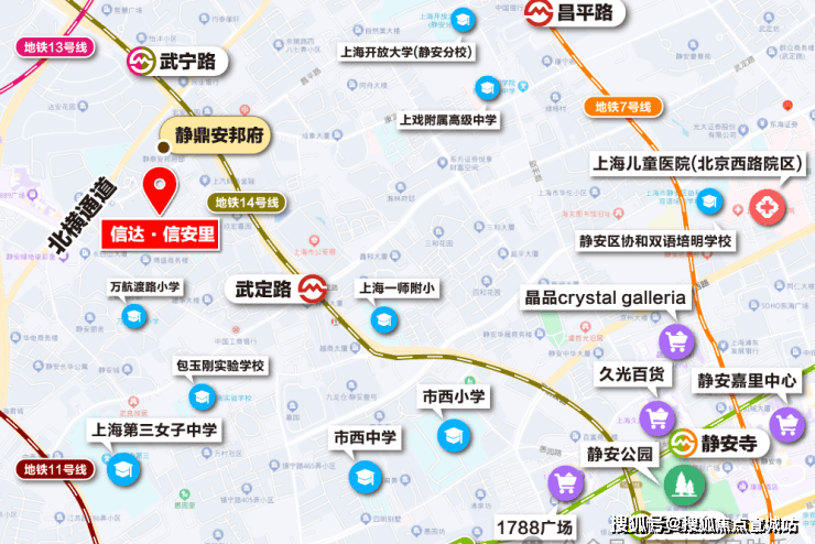 交通配套方面:项目还有着高效的出行系统,增强了通达性。13、14号线都步行可达,武宁路站和武定路站都步行约500米左右。1公里范围内,地铁线路就更丰富了,2号线、7号线的昌平路、隆德路、江苏路、静安寺等市中心地铁站都可步行到达。