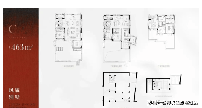 户型价格:高层住宅有90㎡1房2厅1卫和100㎡2房2厅1卫两种户型,均价13.6万/㎡,总价区间为90㎡户型1059-1200万,100㎡户型1250-1584万。别墅有双拼和类独栋,双拼面积在275-541㎡,价格5686-9847万;类独栋463平,价格1.06亿,别墅均价19.98万/㎡。