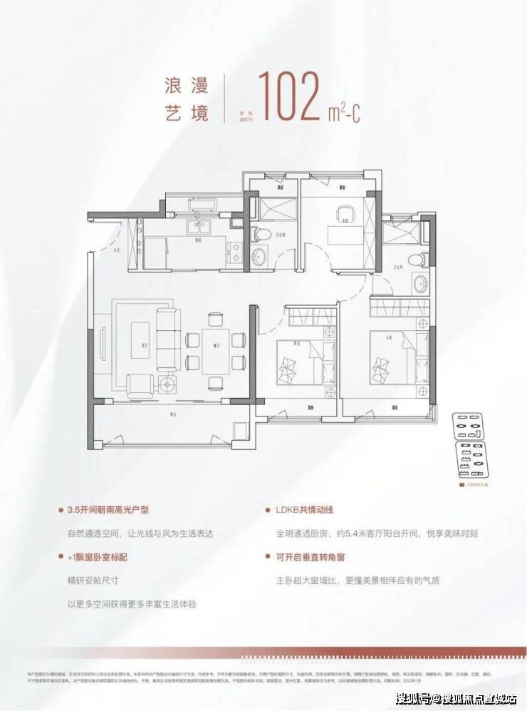 102㎡三房两厅两卫的舒适户型,约5.4m横厅设计,3.5开间朝南,得房率约80%左右(*该得房率仅供参考,最终以开发商官方数据为准);每间房均有飘窗,全屋飘窗共享有额外的面积约13㎡(*此处面积仅供参考,最终以开发商官方数据为准)在市场上也是少有的产品。