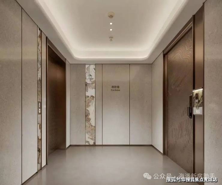 电梯厅融合 梵高印象岩板 与超白洞石大面积的铺装,彰显出了细腻雅致!