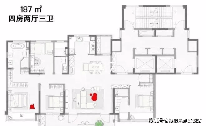 该户型同样为四房两厅三卫,建面约240㎡户型的缩小版。