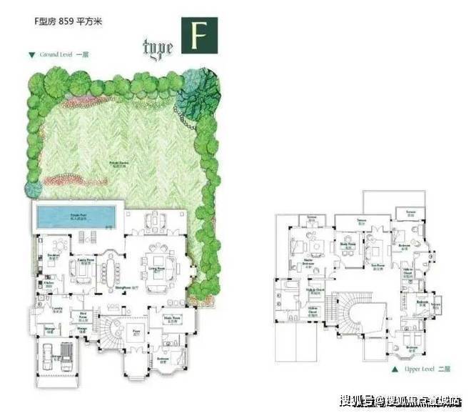 户型布局:地上两层、地下两层,含双车库、挑高宴会厅及南北双花园。