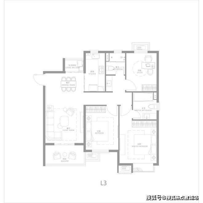 建面约116㎡三房两厅两卫,南北通透,户型方正,主卧大套房,带阳台与独立主卫,更舒适的居住尺度。